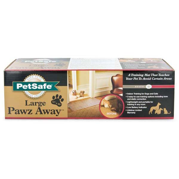 Your pet will quickly learn to avoid areas protected by our popular Pawz Away Mat. When she steps on the mat, she receives a startling static pulse through her paws. Place the Pawz Away Mat in off-limit areas, and your pet will soon learn to associate the correction with the area to avoid. Shell train herself. Lightweight and portable for training in any room. Battery lasts up to 6 months or 10,000 activations.
